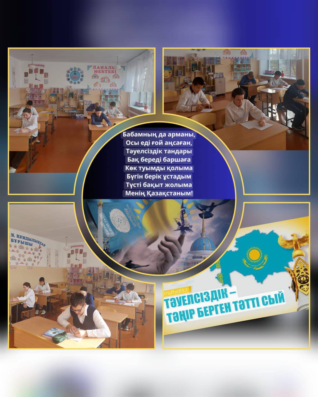 2025 жыл 17 қазан күні Республика күні және Тәуелсіздік Декларацияның 35 жылдығына орай құрастырылған жоспар бойынша 8 "Б" сынып оқушыларымен эссе жазды.