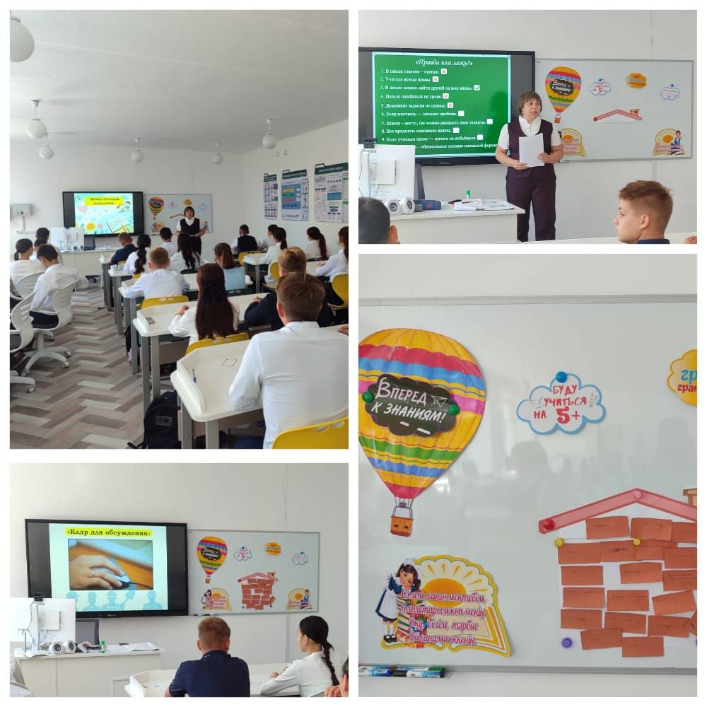 Фильм назывался «Жаңа Қазақстанның рәміздері». Урок начался с беседы, в ходе которой Динара Маратовна задавала учащимся данных классов вопросы о становлении и развитии нашей независимой страны, о роли Первого Президента, сколько Конституции было принято независимым Казахстаном, а также ребята вспомнили и том, как образовалось наше государство. Сұлтан Аружан подняла вопрос об образовании Казахского ханства, дала полный ответ, после чего дети очень активно спорили, исправляли друг друга, дополняли.