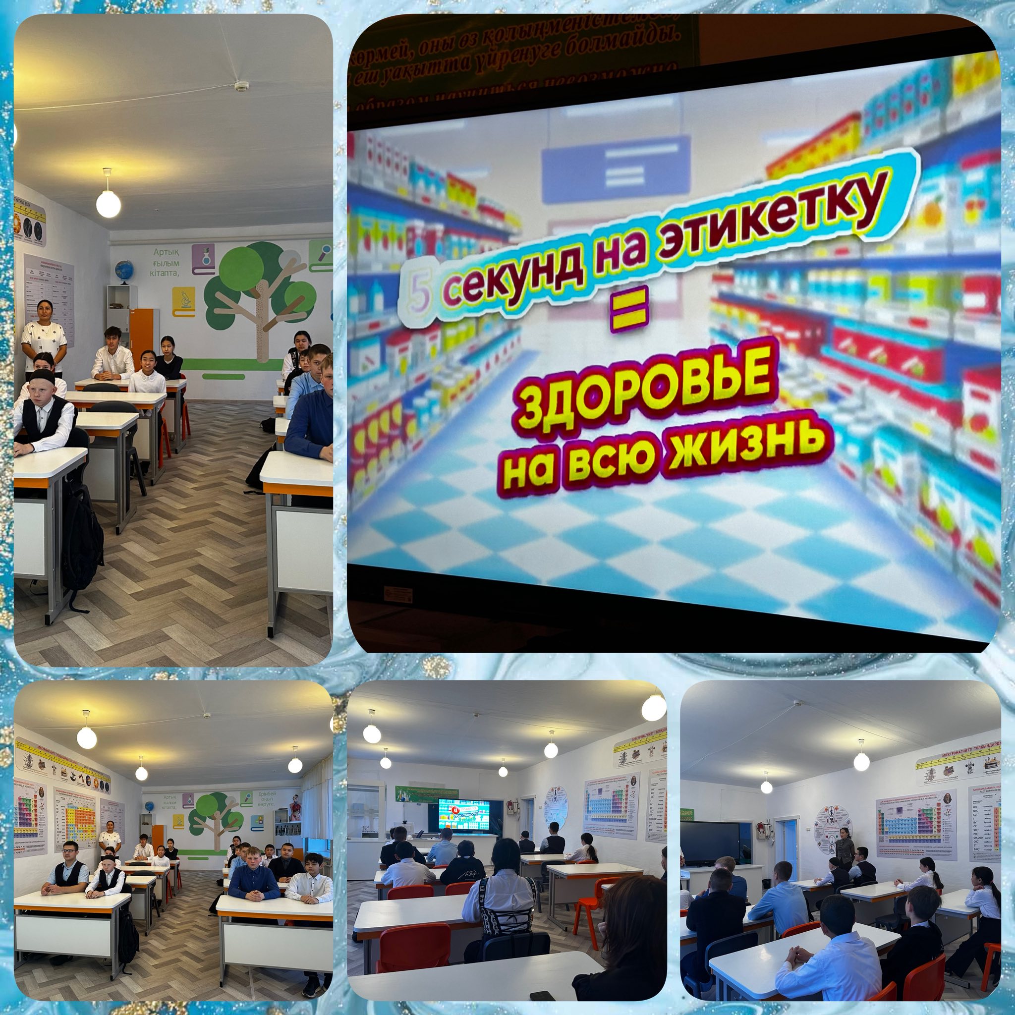 Бейнебаян барысында оқушылар тағам өнімдерін таңдау кезінде этикеткаға назар аударудың маңызын, құрамындағы қант, тұз және түрлі қоспалардың адам денсаулығына әсерін білді.