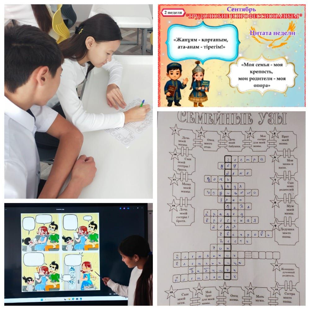 Бүгін "Балалар кітапханасы" жобасы аясында 9б сыныбында "Менің отбасым" тақырыбында сабақ өтті. Оқушылар қызықты тапсырмаларға қатысты: туыстық байланыстар туралы білімдерін бекіте түсу үшін "Отбасылық байланыстар" атты сөзжұмбақ шешті, сонымен қатар артистік қабілеттері мен сөйлеу мәнерін дамытуға көмектескен комиксті дыбыстады.
