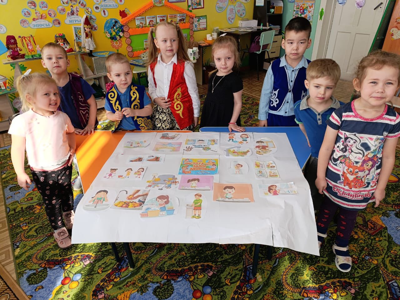 Содан кейін «Гүлдер» тобының балалары «Тазалық — денсаулық кепілі» тақырыбында коллаж жасап, К. Чуковскийдің «Мойдодыр» өлеңін тыңдап, талқылады.