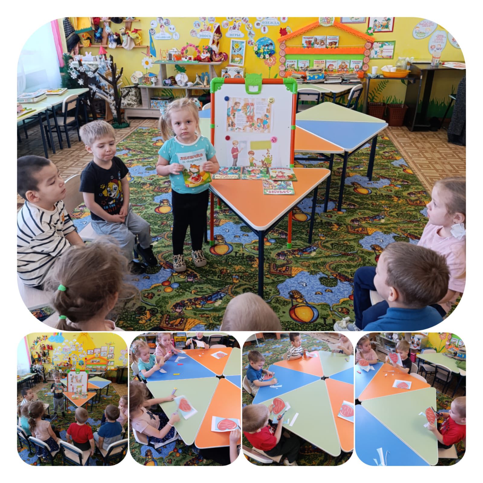 Апта күндері: «Қуыршақ театры», «Мақал-мәтелдер», «Менің сүйікті кейіпкерім», «Шебердің қолы ортақ» тақырыптары қызықты іс-шаралар мен ойын-сауықтарға толы болды. Балалар ертегілер тыңдап, театрландырылған қойылымдарға қатысып, сүйікті ертегі кейіпкерлерін мүсіндеді, атрибуттар жасады, сурет салды, түрлі ойындар ойнады.
